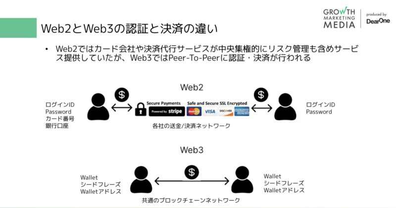 まず認証と決済の話を考えると、Web2の場合だと基本的に、クレジットカード会社あるいは決済代行サービスなどが従来、中央集権的に管理してきました。