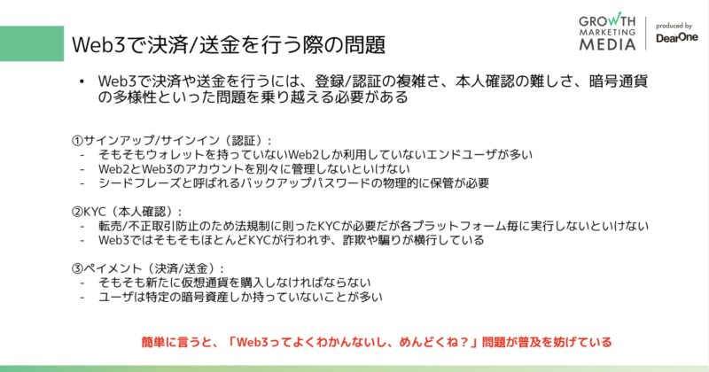 Mr.モリスギ はい。それで、Web3で送金や決済を行うとき、面倒くさくて問題になるのは、「認証」と「本人確認」と「決済/送金」なんですよ。下に赤字で書きましたけど、多くの皆さんは「Web3って何かよくわかんないし、面倒くさそう」という感覚をお持ちだと思うんです。
