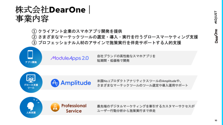 弊社の事業内容としては、アプリ開発「ModuleApps2.0」に加えて、米国No.1の行動分析ツール「Amplitude」、プロフェッショナル人材の人的リソース支援のご提案もしています。