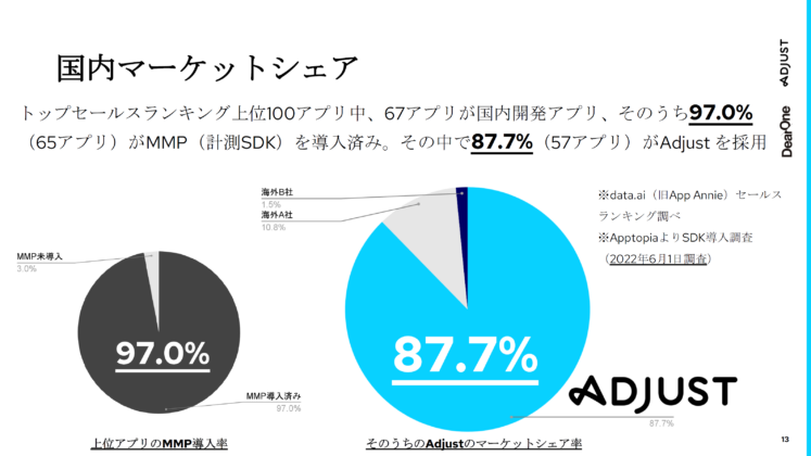 国内マーケットシェアでは、data.ai のトップセールスランキング上位100アプリのうち67アプリが国内開発なのですが、そのうち65アプリがMMP導入済みで、その中の57アプリ、つまり87.7%でAdjustのアプリが採用されています。