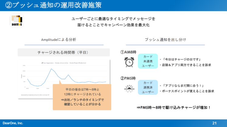 夕方には、カード連携済みのオンラインチャージできる人達だけに狙いを定め、アプリならまだ間に合いますよとプッシュ通知を送りました。すると夕方5時から駆け込みチャージが急増し、額が大幅に伸びました。