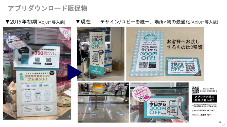 画像左側のAdjustの導入前は、iPhoneとAndroid用のQRコードが2つありました。この時はまだ、スタッフの手書きPOPもあれば、横長のものや説明チックなものもあって、販促物は何がいいか迷っている時期でした。