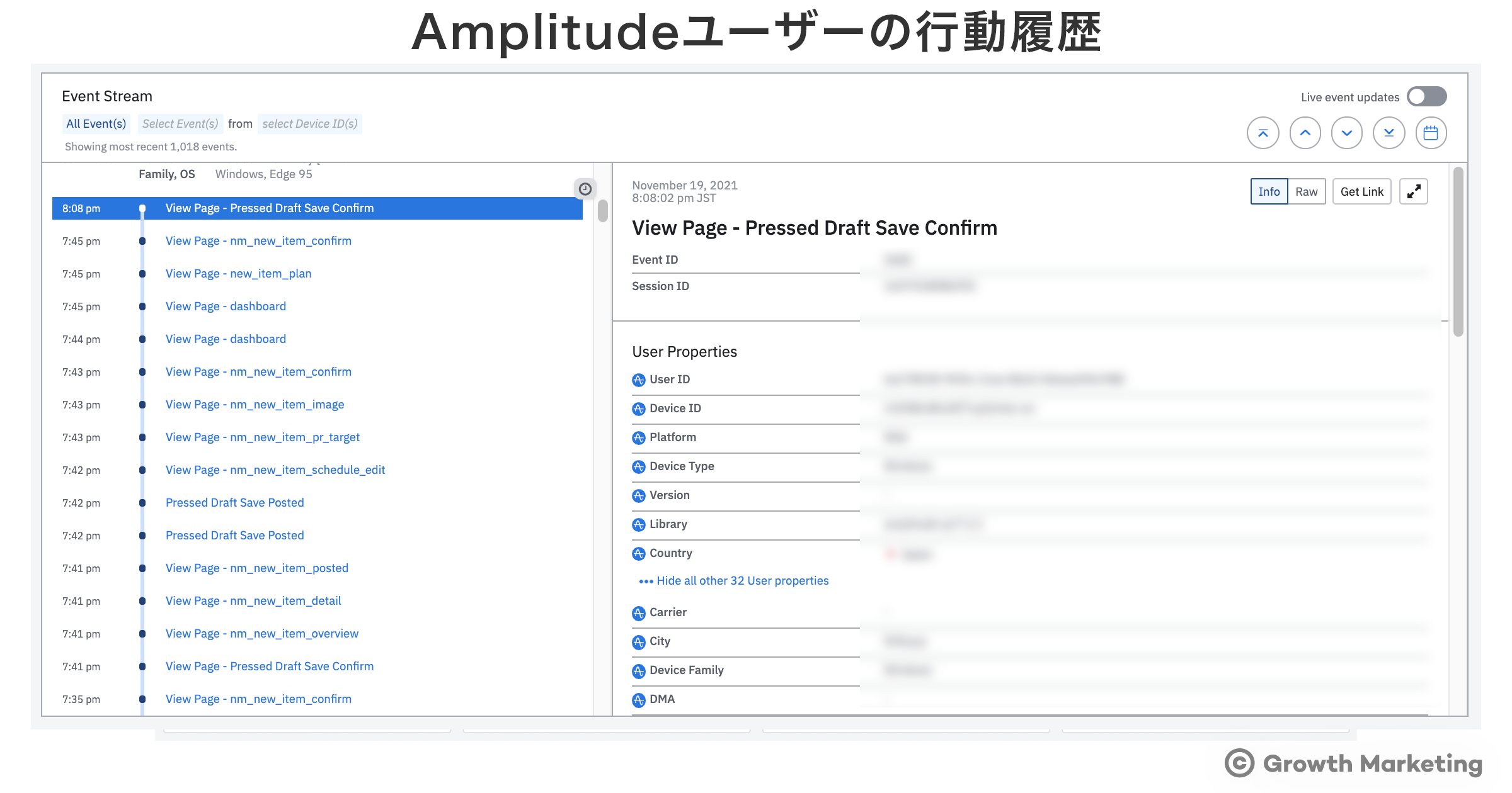 Amplitudeの場合はデータタクソノミーで設計したイベントは全て蓄積されているので、ユーザーの画面上の操作といった行動履歴を一番細かく蓄積されています。