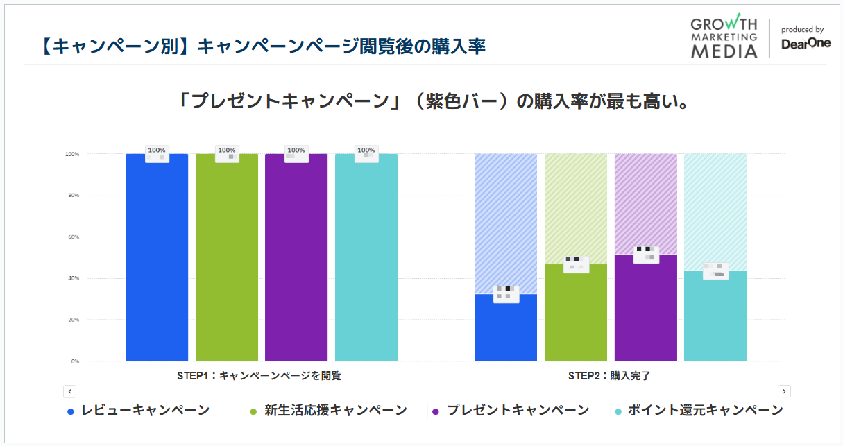 キャンペーンごとの購入率を調べると、「プレゼントキャンペーン」(紫色のバー)の購入率が最も高いことが分かります。