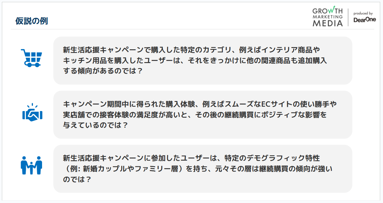 例えば、「キッチン用品を購入したユーザーの多くが、次回の購入で食器類を選択する傾向がある」ことが分かったため、「セット割引やおすすめセットを促進することで、さらなる売上増加が見込めるのでは」といった施策の方針を立てることにつながりました。