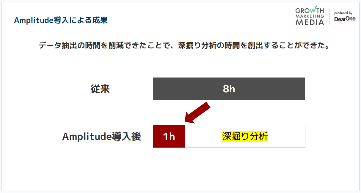 これまで、1施策あたり、データ抽出から集計までに約8時間かかっていましたが、Amplitudeを使うことによって約1時間まで削減することができました。