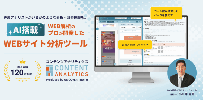 CONTENT ANALYTICSは、株式会社UNCOVER TRUTH提供の、AI搭載Webサイト分析ツールです。ページ内の各コンテンツ要素をAIが自動認識し、それぞれのパフォーマンスを定量的に分析します。