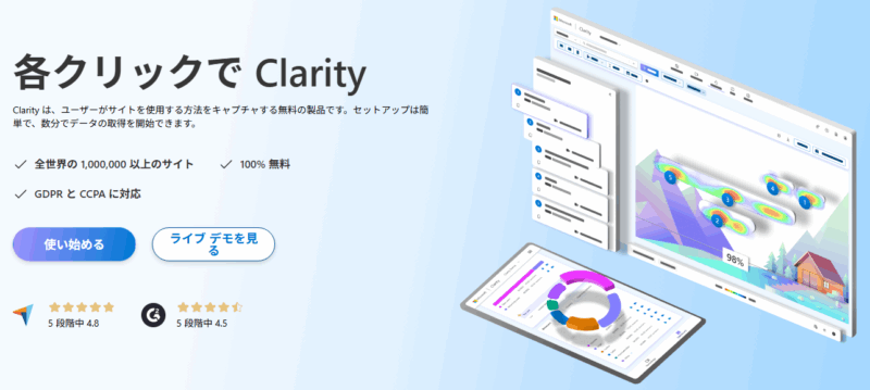 Microsoft Clarityは、Microsoft社が提供する完全無料のヒートマップツールです。無料でありながらPV数やセッション数の制限がなく、有料ツールに匹敵する高機能を備えています。