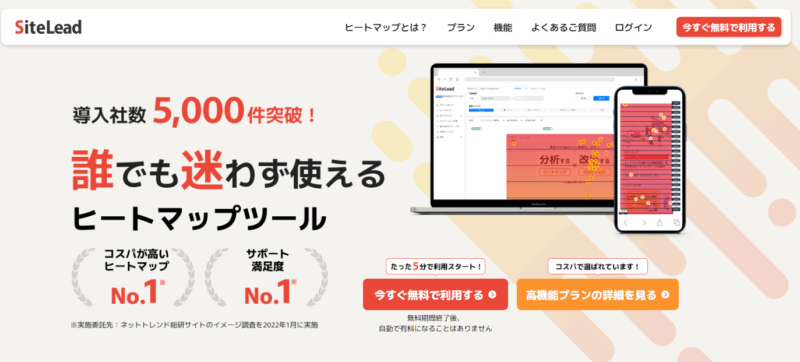 SiteLeadは、株式会社N1テクノロジーズが提供する、業界最安値水準のWebサイト改善ツールです。最短5分で導入可能な手軽さと、低価格ながら必要十分な機能を備えている点が魅力となっています。