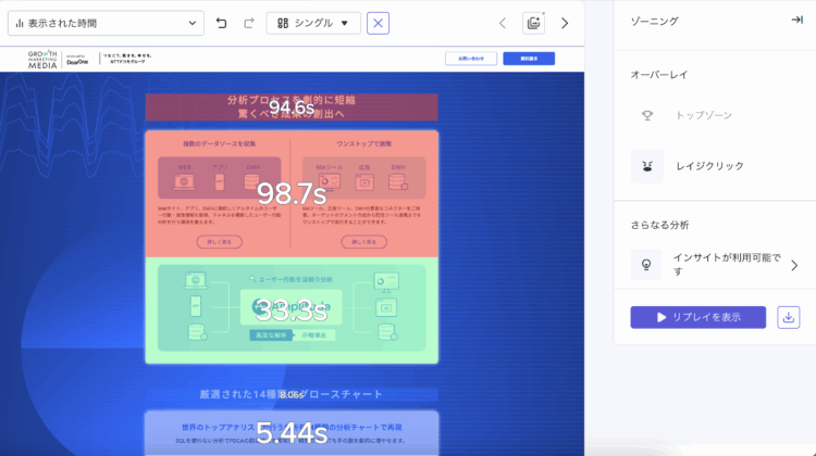 AIを活用した高度な分析機能により、ユーザー行動の複雑なパターンを自動で認識し、改善提案を行ってくれます。また、ゾーニング分析機能により、ページ全体だけではなくパーツごとにクリック率や露出率を可視化できるため、効率的にWebサイトの改善を行うことができます。