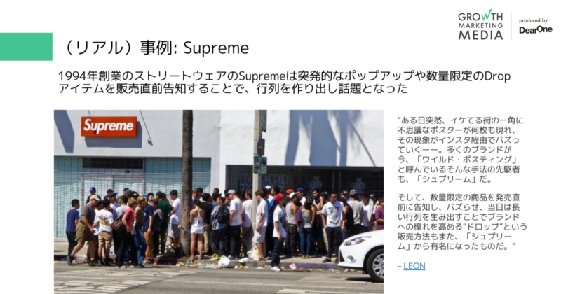 別の例では、ファッションブランドとして人気の高い「Supreme」が先進的にドロップモデルを採用しています。突発的にポップアップストアを出したり、そこで数量限定アイテムを販売し、「レア」「今買わないとなくなる」といった感覚を演出し、行列を生み出しました。このようにドロップモデルの手法は、例えばLouis VuittonやハンバーガーチェーンのShake Shackなどさまざまな企業が模倣する主流のマーケティング手法になってきています。