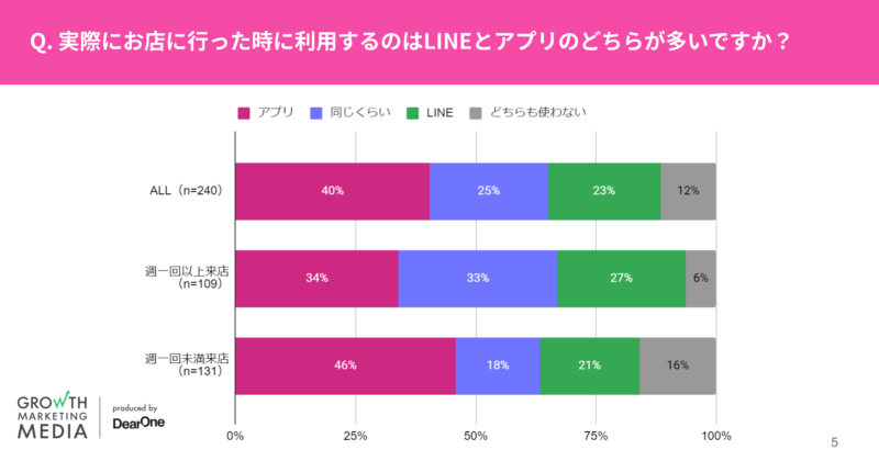 参加企業もLINEとアプリの使い分けには興味をお持ちで、参加者の現在のLINEとアプリの利用状況をアンケートしたところ、以下の結果でした。