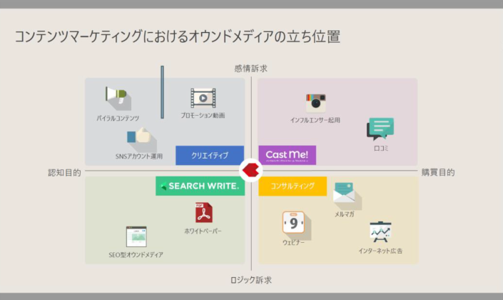 コンテンツマーケティングの全体像を把握する際によく使われる図があり、縦軸の上から下に向って「感情訴求→ロジック訴求」、横軸の右から左へ「購買目的→認知目的」の手法でマッピングしています。