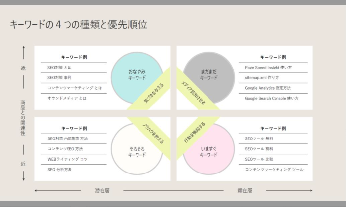 SEOを意識してメディアを運用する場合、キーワードの選び方が重要になります。そこで、下図のように横軸に潜在層と顕在層、縦軸に商品との関連性の遠・近を設定します。例として、SEOツール販売を目的としたメディアを作る前提でご参照下さい。
