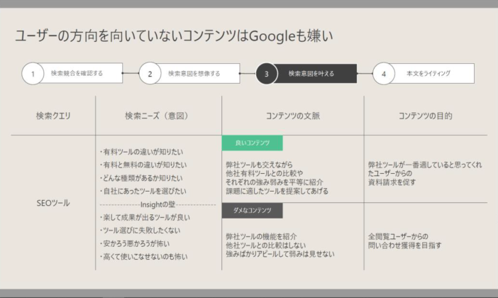 Googleの表明通り、ユーザーの期待を200%叶えるコンテンツを目指すことが上位表示やコンバージョンにつながります。そこで、4つのステップをご紹介します。