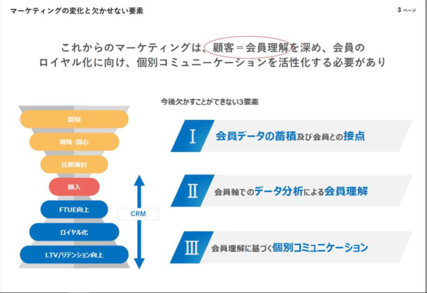 新規顧客獲得が飽和状態である現在、サービスのファン、いわゆる「ロイヤルカスタマー」を増やす観点からCRMを強化することが求められています。そのためには顧客理解が必要となります。