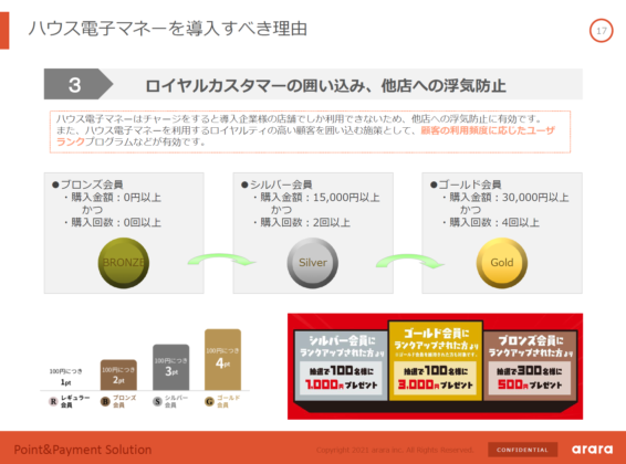 ハウス電子マネーは、一度チャージをした導入企業様の店舗でしか利用できない為、他店への浮気防止に有効です。また、ロイヤリティの高い顧客を囲い込む為に、顧客の利用頻度に応じたユーザーランクプログラム等の施策が有効です。