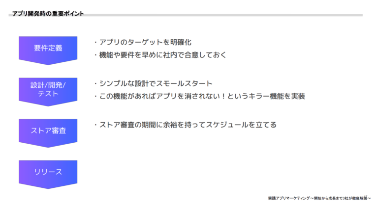 - 「ストア審査」…このフェーズでは、リジェクト(もう一度出し直し)も発生するので、計画通りのリリースを実現するため、余裕を持ったスケジュールを立てることが重要。