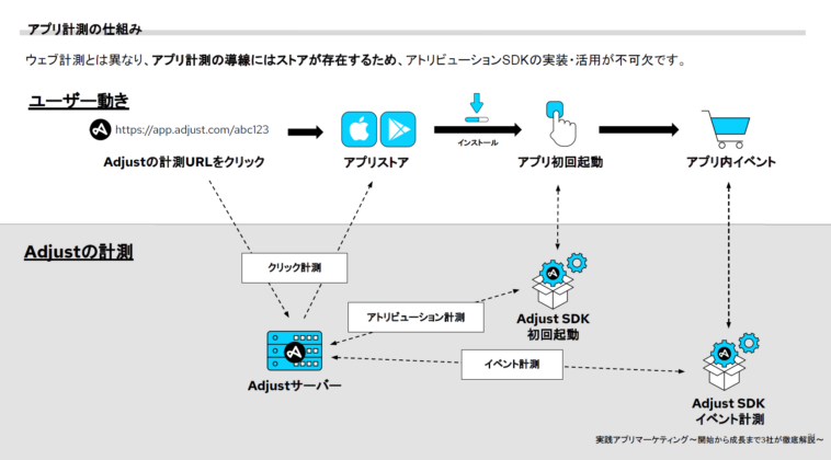 計測方法は、Adjustの計測URLをクリックしてアプリストアへ入り、ユーザーがインストールやアプリ起動から会員登録へとアプリ内行動をする裏で、クリックやインストールのアトリビューション計測・初回起動時や会員登録時のイベント計測を行う形です。