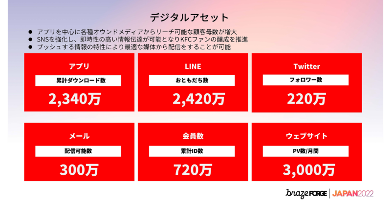 KFCのデジタルアセットの現状についてお話しします。自社アプリが2,300万人以上、LINEは2,400万人以上、昨年度くらいからTwitterでのコミュニケーションにも力を入れており220万人、メールの登録者数はかなりいますが配信可能数は300万人、会員数は720万人、Webサイトは月間PV3,000万人程となっています。昔からの蓄積で認知できる母数はだいぶ増えてきました。SNSは強化しており、コミュニケーションを取れる手段が増えてきています。