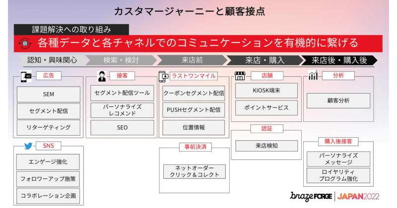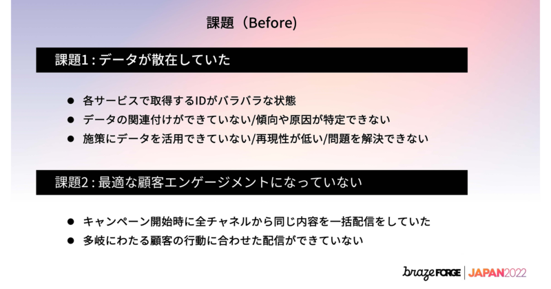 カスタマージャーニーを分析した結果、顧客接点として行動のフェーズごとにデジタルタッチポイントが存在していて、コミュニケーションが取れるはずなのですが、キャンペーン開始時に全チャネルから一斉配信していたため、コミュニケーションが上手に取れていませんでした。課題解決の取り組みとして、各種データと各チャネルでのコミュニケーションを有機的に繋げることを目指しています。
