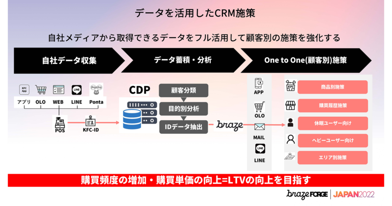 直近でのCRMのプロセスについて紹介します。来店・購入前にKFCの様々なタッチポイントから流入し、データが集まりKFC IDで連携されて店舗で管理します。それがPOSと繋がり、CDPに入り、CDPからセグメントされるデータを使ってBrazeで施策を実施していきたいと考えています。
