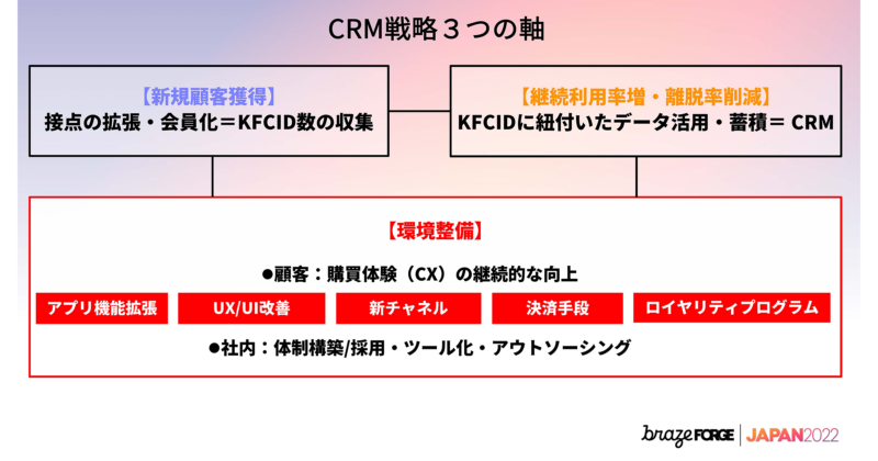 上記LTVを向上させるために現在、3つのCRM施策を実施しています。1つ目に、新規顧客獲得の顧客の取り込み、その人たちを会員化していくためにIDを収集しています。2つ目がKFC IDに基づいたデータの活用・蓄積です。継続利用率増加や離脱率減少を目的にしています。3つ目が新規顧客獲得と継続率増加のための環境整備です。顧客に向けては、購買体験(CX)の継続的な向上、サービスの向上を目指しています。社内向けには、体制構築、ツール化、アウトソーシングの3つを軸に戦略を回していきたいと考えています。