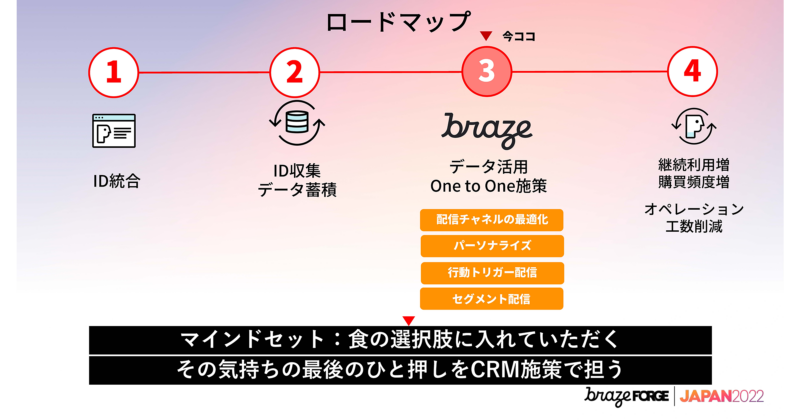ロードマップとしては、今現在スライド上の3番の段階です。IDの統合からIDの収集が始まったので、その集めたデータを使ってBrazeでOne to One施策を行っていきます。お客様に持って頂きたいマインドセットとしては、ケンタッキーフライドチキンを食の選択肢に入れていただきたいと思っています。1日3食、365日ある食事の機会のうちの1つに選択肢として持っていただき、ケンタッキーフライドチキンを食べたいと思ったときにその気持ちの最後の一押しをCRM施策で担っていきたいと考えています。