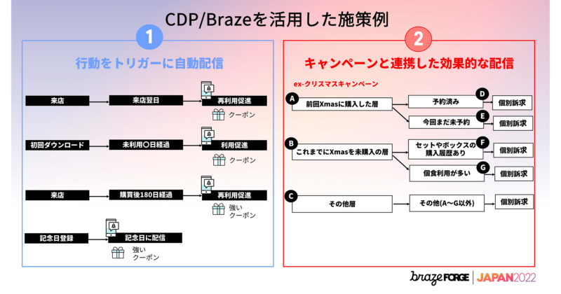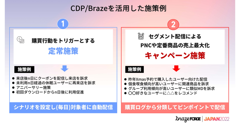 CDPやBrazeを使った施策の例を1つずつ紹介します。まず購買行動をトリガーする施策。これは定常的に行っていく施策で、例えば来店後何日にクーポンを配信して来店を訴求する、初回ダウンロードから利用がないお客様に対して、何日後にクーポンを配信して利用促進するなど、シナリオを設定して対象者に自動配信していくといったものです。