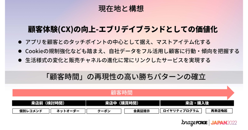 最後に現在地と構想についてお話しします。顧客体験の向上とエブリデイブランドとしての価値化を進めていきたいと考えており、アプリを顧客とのタッチポイントの中心としてマストアイテムにして、自社データをフル活用した顧客の行動や傾向を把握したいと思っています。生活様式の変化と販売チャネルの進化に常にリンクしたサービスを実現したいと思っています。最終的に目指したいのはお客様がお客様でいてくれる時間に対して再現性の高い勝ちパターンのサイクルを回して行きたいと考えています。