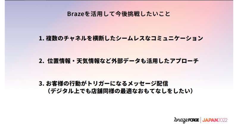 はい、検討しました。元々はグローバルのマネジメント会社からグローバルの事例としてBrazeを紹介していただいたのがきっかけでした。同時にMAツール導入も検討していましたが、身の丈にあったものが欲しいと思っていました。たとえばSalesforceだと、機能がありすぎてツールの導入が目的となってしまい、自分たちでマネジメントしていくのは難しいなと思ってBrazeを使ってみることにしました。まずは、メール配信で試してみることにしました。Brazeの担当者ともアプリやWebで使っていく際にどういったことができるかを話し合って、自分たちで管理できそうだということがわかったので、採用するに至りました。全部自走できるとは考えていませんが、スピード感を持ってPDCAを早く回したいと考えているので、自分たちで管理できることが重要だと考えました。