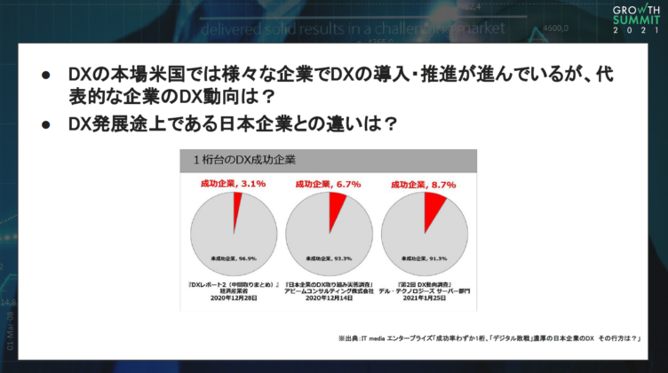 日本が遅れているというより、2016年頃から米国全土でデジタル化が一気に進んだという方が正しいと思います。流通やクルマ、金融といった異なる業界が、デジタル化の必要性に関しての危機感を抱き、高速での進化と大型投資を行ったため、デジタル化が急速に進んだと言えます。