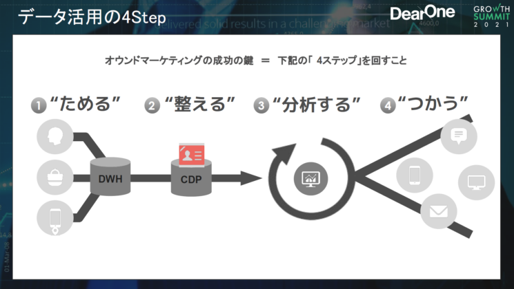 DX推進の実践で重要となるデータ活用の4Stepは、情報を①ためて ②整えて ③分析して ④つかう ことです。これを実際に回す際にDXの要諦となるところを、組織及びプロジェクトの進め方の観点から、志賀さんにお話頂きます。