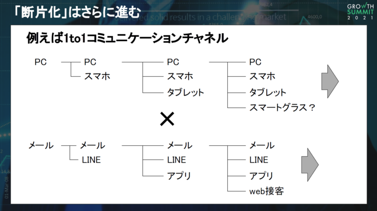 実際に断片化は非常に進んでおり、例えばOne-to-Oneコミュニケーションチャネルでは、デバイスもアプリもツールも増えている中、顧客が何を使用しているか把握できず、顧客層によって取るべき戦略も変わるため、自社の環境下で実践してみる必要があります。