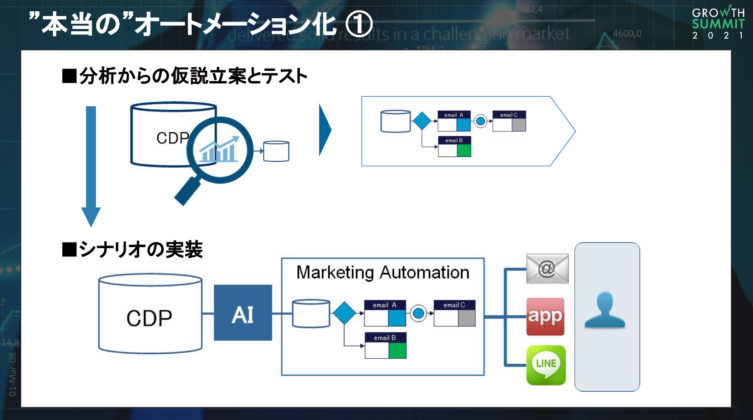 現在は機械学習の導入で、決定した目的変数に対応する抽出が可能になり、MAとつないでいる企業様もいらっしゃいますが、分析から仮説立案の過程は人間の頭で考えてから実装しているケースがまだまだ多いです。