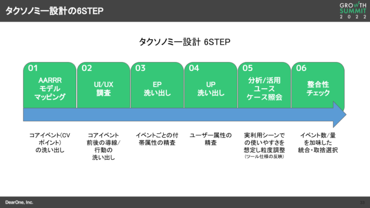 タクソノミー設計には6つのステップがあります。まず最初のステップでは、AARRR*3Acquisition(獲得)、Activation(活性化)、Retention(継続)、Referral(紹介)、Revenue(収益)。グロースにおける顧客行動の分解モデル。と呼ばれるグロースのモデルに沿って、自社プロダクトにとってのコアイベントの洗い出しを行います。
