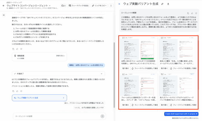 もう一つ、ウェブサイトコンバージョンエージェントも紹介させていただければと思います。URLベースでこのページをAIが見ていきながら課題がどこにあるかやデッドクリックがどこにあるかなどを特定していく機能になっています。