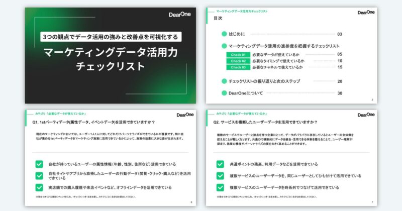 自社のマーケティングデータ活用力を客観的に把握できるチェックリストです!「データの種類」「活用タイミング」「活用チャネル」の3つの軸で整理し、現状の強みと改善ポイントを可視化することができます。