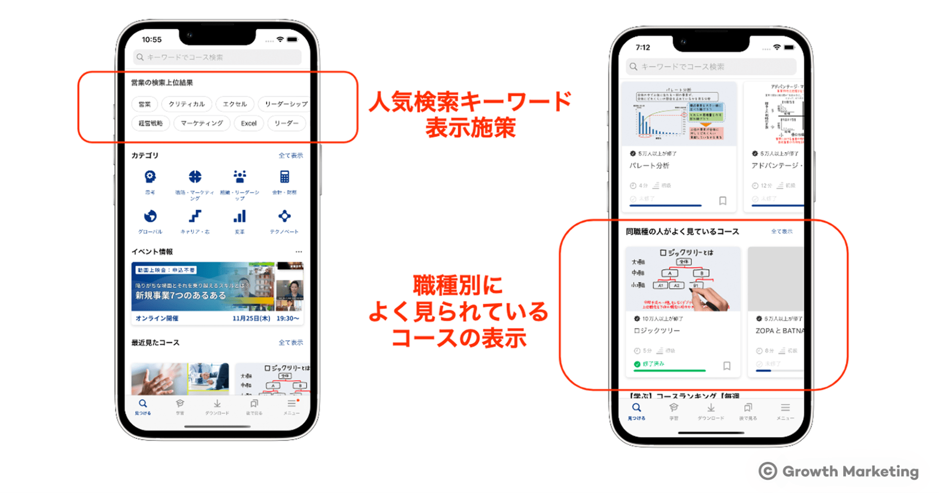 そこで、例えば営業職のユーザーの方なら、自分と同様の他の営業職のユーザーがよく検索しているコース、よく見ているコースはどれか、といったことをUIのわかりやすい箇所で提示することにより、まずはそのコースを見てみようという行動を取って頂く施策がヒットしました。