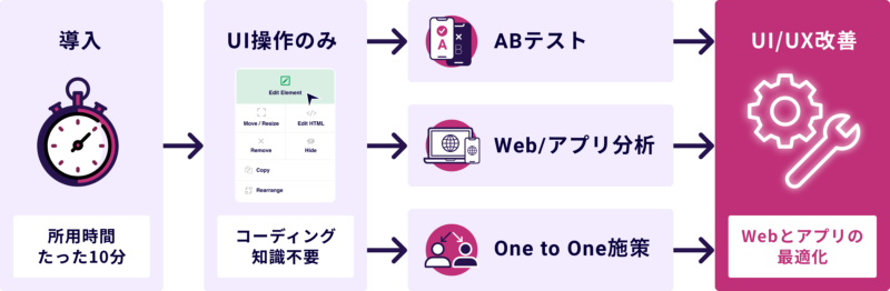 | 操作性 | 最短1分でABテストを開始可能 すべての操作をクリック操作のみで完結 |