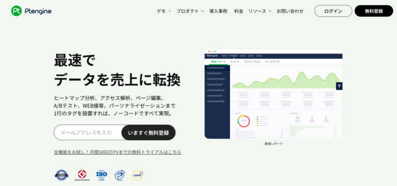 | 主な機能 | ABテスト、多変量テスト、リダイレクトテスト、ヒートマップ、セッションリプレイ、入力フォーム分析、パーソナライズ機能、GA4公式連携 |