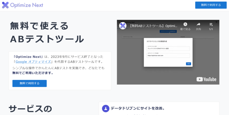 Optimize NextはGoogle Optimizeの後継として開発された国産ツールです。有料プランもあるものの、無料プランでのテスト回数や機能にほぼ制限がなく、無料プランでも十分なパフォーマンスを発揮してくれます。